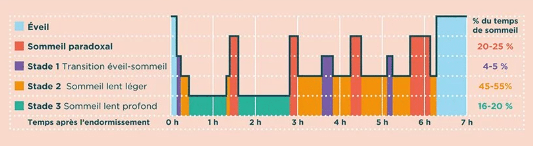 Le sommeil est organisé en cycles de 90 minutes alternant sommeil lent (récupération physique) et sommeil paradoxal (récupération psychologique et rêves).